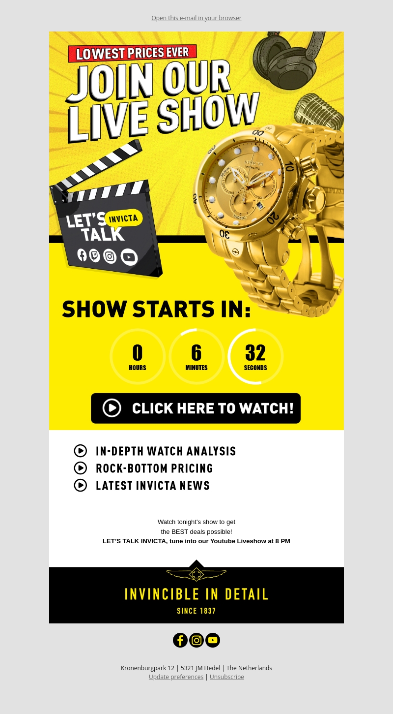 Ontdek de meest iconische Invicta horlogecollecties tijdens onze speciale live show. Profiteer van ongekende laagste prijzen en krijg diepgaande analyses van elk horloge. De show geeft een exclusieve kijk op de nieuwste modellen en dealinformatie. Dit is de perfecte kans om je favoriete Invicta horloge te bemachtigen voor een scherpe prijs. Mis het niet en meld je nu aan voor de livestream. Kijk mee via onze kanalen en blijf up-to-date.