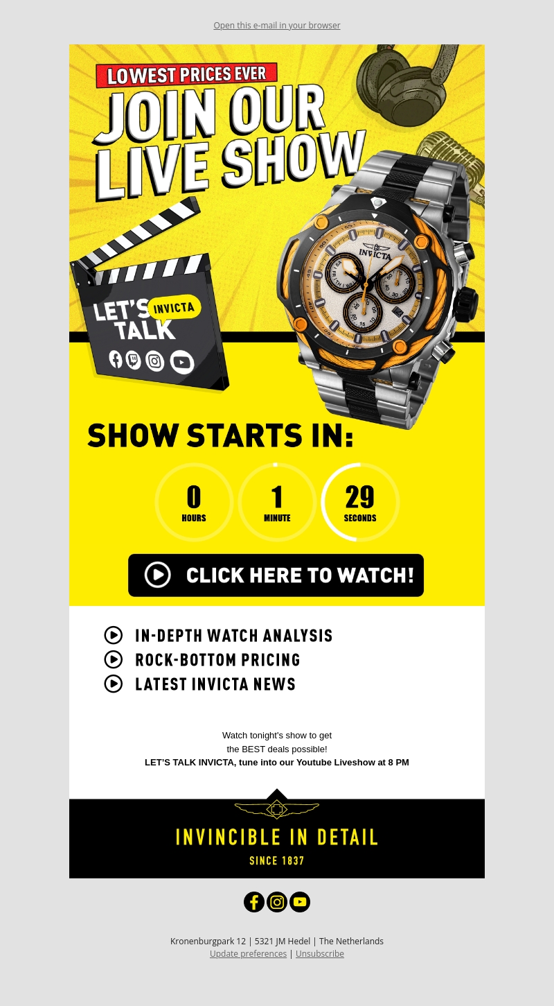Mis de kans niet om zeldzame Invicta-horloges te ontdekken tijdens onze live show. Geniet van diepgaande horloge-analyses, ontdek prijzen die nergens anders te vinden zijn, en blijf op de hoogte van het laatste Invicta-nieuws. Stem vanavond af op onze YouTube-liveshow om de beste deals te krijgen. Een evenement dat u niet mag missen!