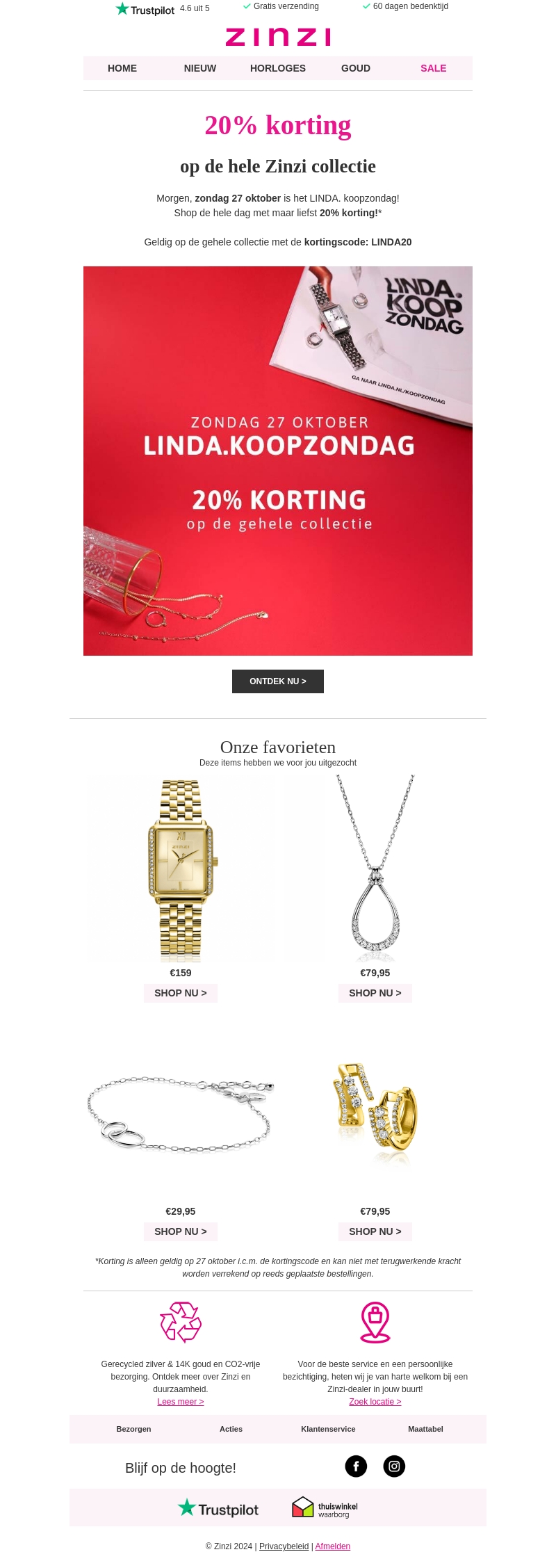 Morgen is het LINDA. koopzondag en Zinzi biedt 20% korting op de volledige collectie. Ideaal voor diegenen die op zoek zijn naar stijlvolle nieuwe sieraden. De korting is geldig voor één dag, dus mis het niet. Bezoek de Zinzi website en gebruik de kortingscode LINDA20. Ontdek de mooiste sieraden en accessoires. Koop snel in voor sinaasappelsieraden.