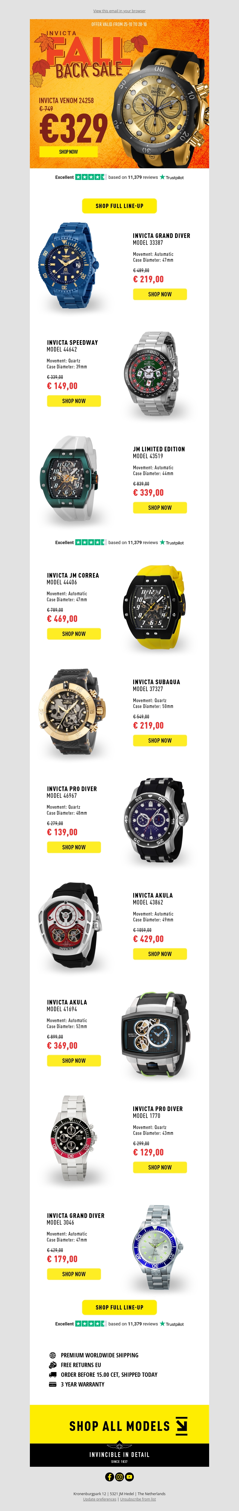 Mis de kans niet om te profiteren van geweldige kortingen tijdens onze Wintertijd Horlogedeals! Van Invicta tot JM Limited Edition, er is voor ieder wat wils. Geniet van premium verzending en een driejarige garantie. Bekijk onze volledige collectie en vind uw perfecte uurwerk. Wees er snel bij, de voorraad is beperkt!