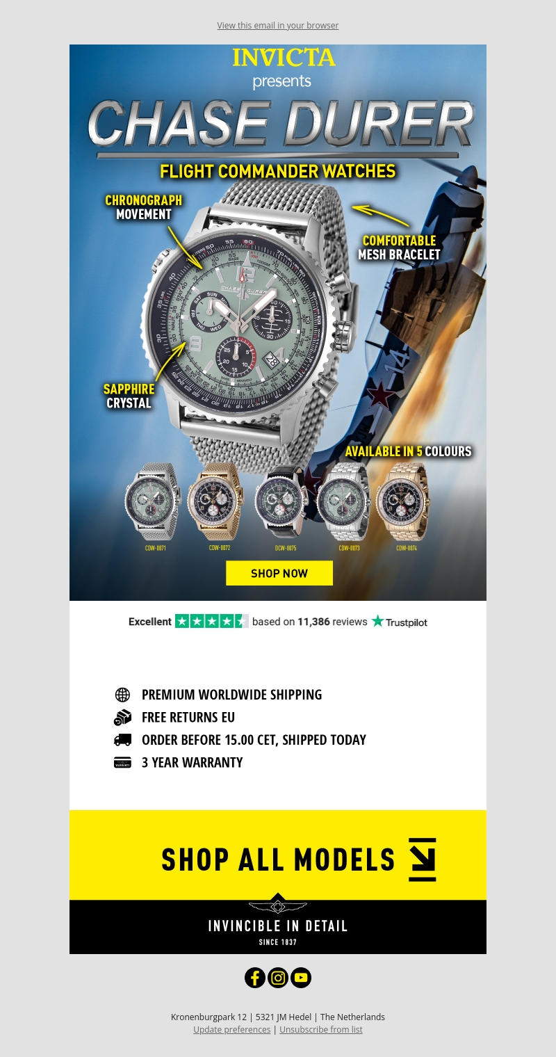 Ontdek de nieuwste collectie Flight Commander Watches van Invicta. Deze aviator-geïnspireerde horloges bieden een chronograaf beweging en een comfortabel mesh bandje. Verkrijgbaar in vijf kleuren, deze horloges combineren stijl met functionaliteit. Bestel voor 15.00 uur en ontvang je bestelling vandaag nog.
