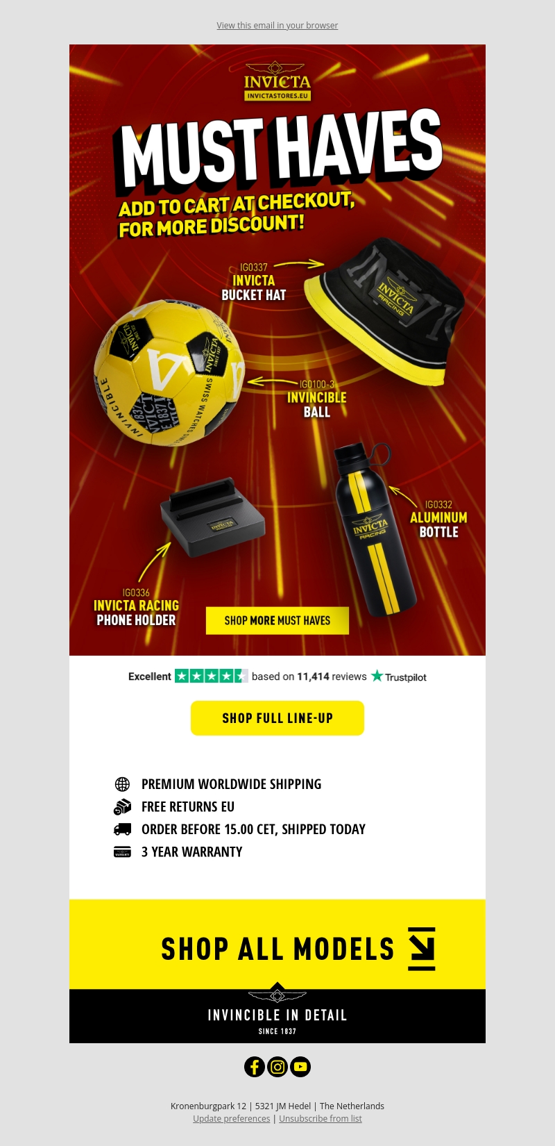Ontdek de nieuwste merchandise van Invicta, waaronder de stijlvolle bucket hat en de handige aluminium fles. Voeg deze must-haves toe aan je winkelmandje voor extra korting. Profiteer van premium wereldwijde verzending en gratis retourneren binnen de EU. Bestel voor 15.00 uur en ontvang je bestelling nog dezelfde dag. Geniet van een garantie van drie jaar op alle producten.