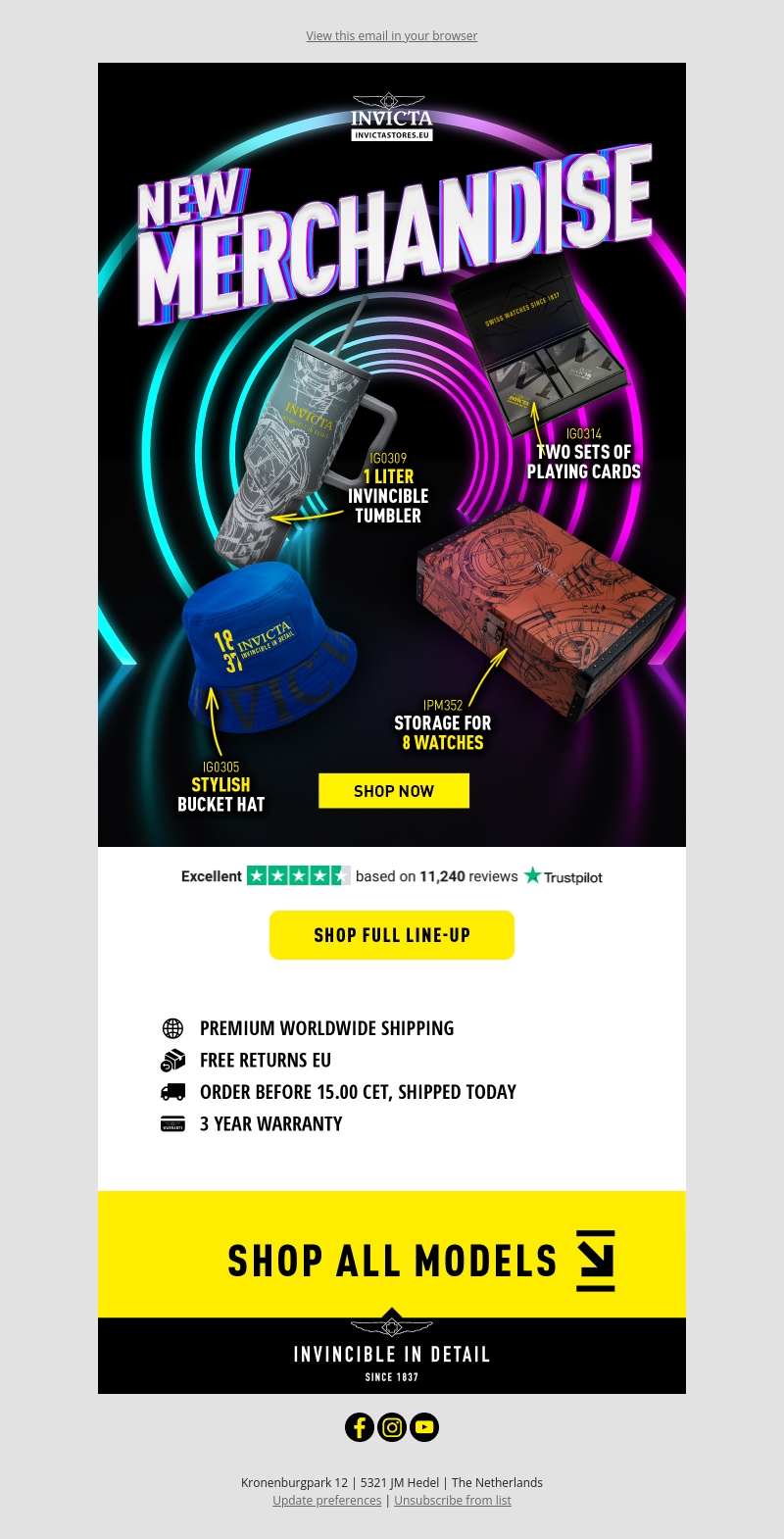 Invicta biedt nu geweldige nieuwe merchandise aan, waaronder een 1 liter onoverwinnelijke mok, twee sets speelkaarten, een stijlvolle emmerhoed en een opbergdoos voor acht horloges. Profiteer van premium wereldwijde verzending, gratis retouren in de EU en een garantie van 3 jaar als u vandaag nog bestelt.