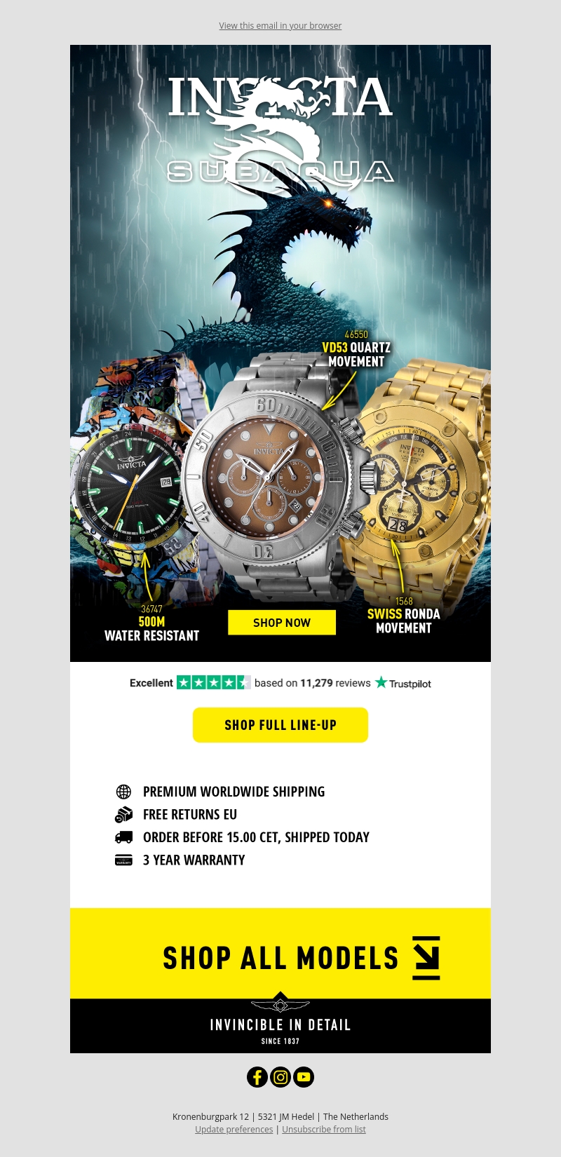 Ontdek de elegante en robuuste horloges uit de Subaqua collectie van Invicta. Deze collectie biedt waterbestendigheid tot 500 meter, nauwkeurige quartz- en Ronda-bewegingen en een ongeëvenaarde garantie van 3 jaar. Met gratis verzending wereldwijd en gratis retourneringen binnen de EU, is dit het perfecte moment om stijlvol te duiken.
