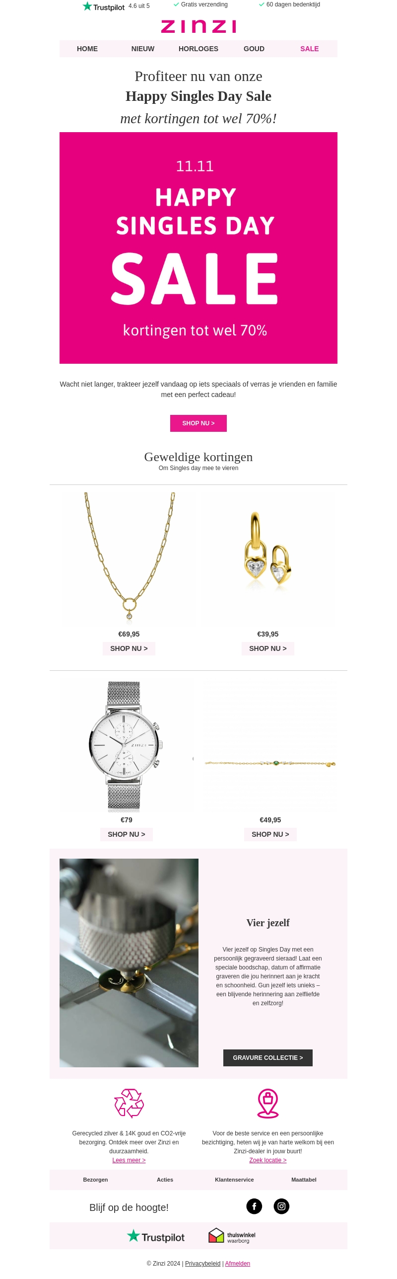 Singles Day is hier en Zinzi biedt geweldige kortingen tot wel 70%! Of je nu sieraden voor jezelf of een cadeau voor iemand anders zoekt, dit is de perfecte kans. Verwen jezelf met de mooiste kettingen, armbanden en horloges. Ontdek onze speciale gravurecollectie voor dat extra persoonlijke tintje. Mis deze kans niet om iets bijzonders te scoren.