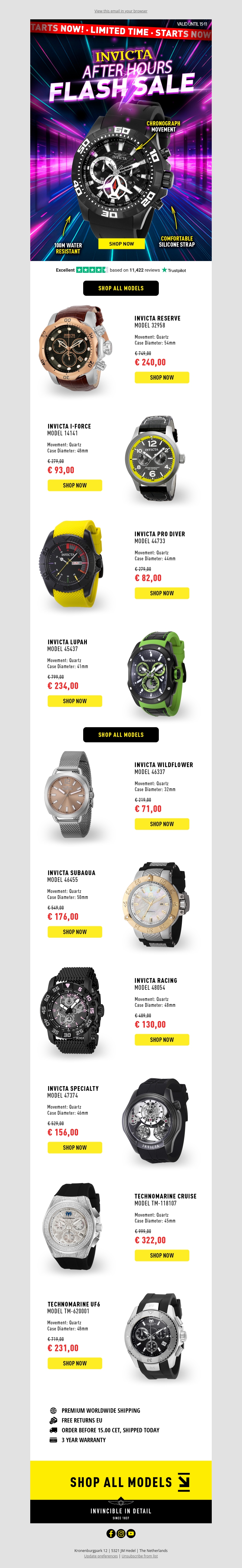 Mis deze kans niet op de spectaculaire Invicta Flash Sale. Met kortingen tot wel 61% vind je een breed scala aan stijlvolle horloges. Ontdek modellen met hoogwaardige materialen en innovatieve ontwerpen. Wees er snel bij, want deze aanbiedingen zijn slechts tijdelijk beschikbaar. Geniet van gratis verzending en een garantie van 3 jaar. Koop vandaag nog jouw favoriete model!