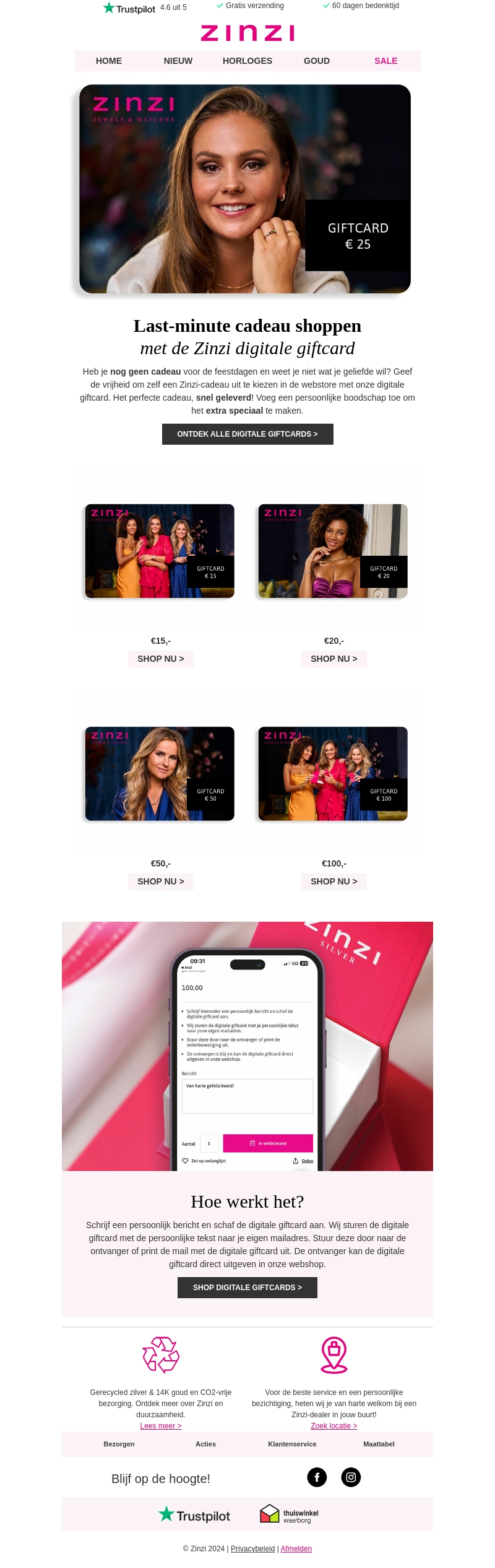 Heb je nog geen cadeau voor de feestdagen? Kies voor de Zinzi digitale giftcard! Geef de vrijheid om zelf een cadeautje te kiezen uit de webshop met snelle levering. Voeg een persoonlijke boodschap toe om het extra speciaal te maken. Ideaal voor last-minute cadeau-ideeën.