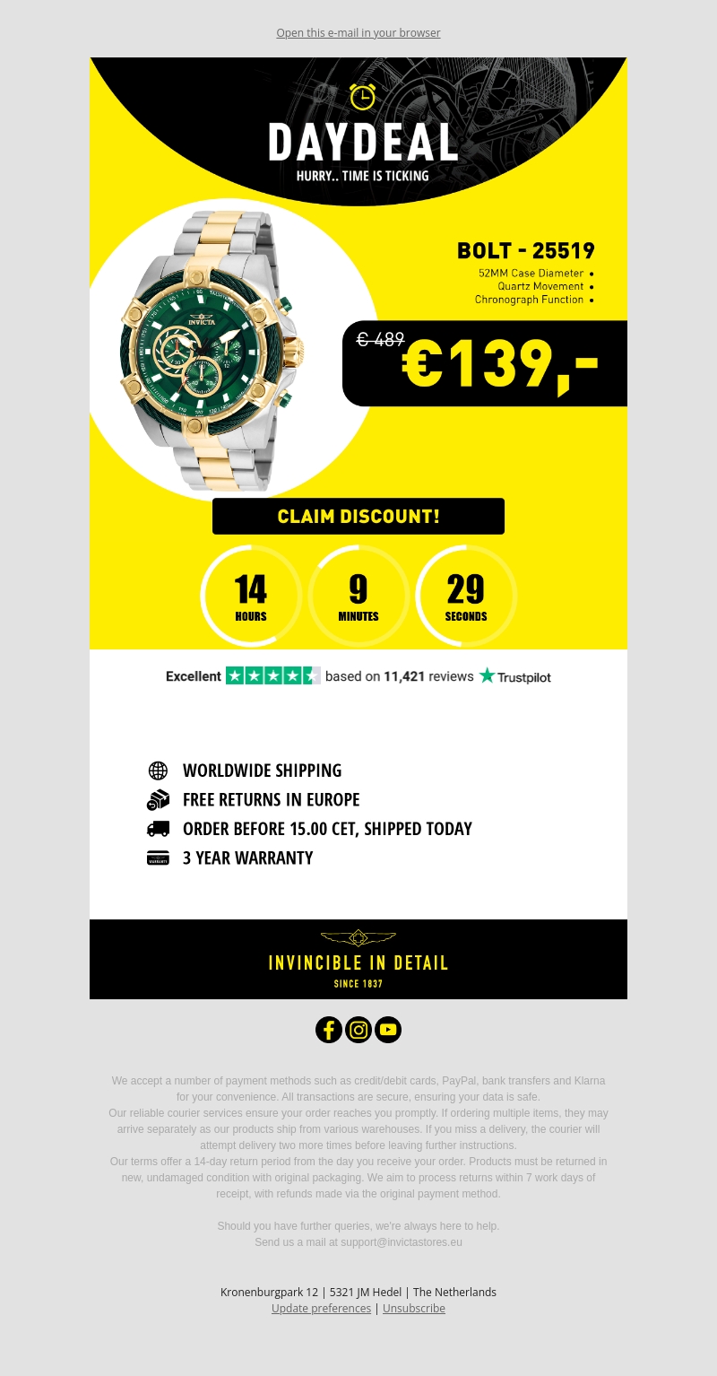 Mis deze unieke kans niet om de Invicta Bolt 25519 te bemachtigen tegen een geweldige prijs van €139, met een enorme korting van €350! Dit uurwerk heeft een 52MM kastdiameter, kwartshorloge en handige chronograaf functie. Geniet van gratis verzending en een garantie van 3 jaar. Bestel voor 15.00 CET en profiteer van verzending op dezelfde dag.