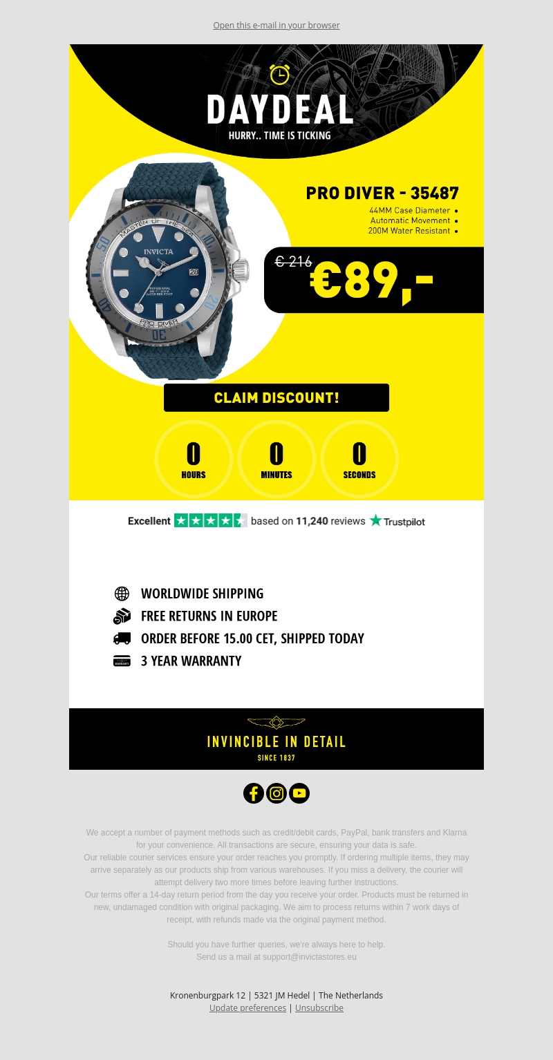 Mis deze exclusieve dagdeal niet! De Invicta Pro Diver Automatic is nu beschikbaar voor slechts €89,- in plaats van €216,-. Dit horloge heeft een 44MM kastdiameter, automatische beweging en is waterbestendig tot 200M. Profiteer van wereldwijde verzending, gratis retourneermogelijkheden in Europa, en 3 jaar garantie.