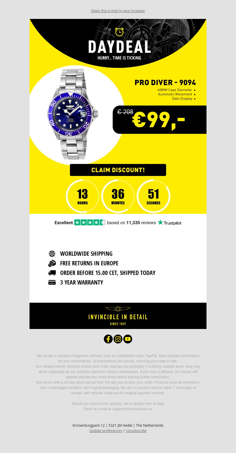 Grijp je kans op de stijlvolle Invicta Pro Diver Automatic voor een ongelooflijke prijs van €99! Deze aanbieding biedt een horloge met een 40MM kastdiameter en automatische beweging. Perfecte aankoop met wereldwijde verzending en gratis retouren binnen Europa. Bestel vóór 15.00 CET en het wordt vandaag nog verzonden. Profiteer nu van deze deal!