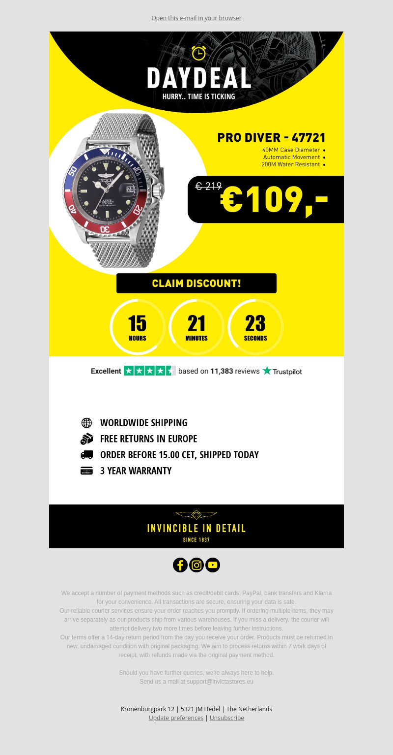 Beleef de ultieme duikervaring met de Invicta Pro Diver horloge, nu voor slechts €109,- in plaats van €219,-. Dit horloge heeft een kastdiameter van 40MM, automatische beweging en is waterbestendig tot 200M. Bestel nu en profiteer van gratis verzending wereldwijd, gratis retourneren in Europa en een garantie van 3 jaar.