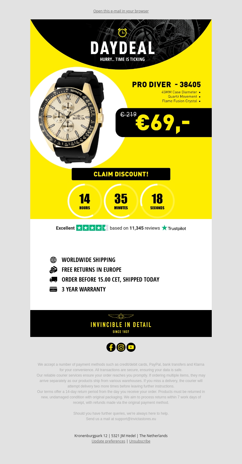 Vandaag heb je de kans om de Invicta Pro Diver te bemachtigen voor slechts €69, een flinke korting op de oorspronkelijke prijs. Deze elegante horloge biedt een 45 mm kastdiameter, Kwartsmechanisme en een Flame Fusion kristal voor extra duurzaamheid. Met wereldwijde verzending en gratis retour in Europa is deze deal niet te missen. Zorg ervoor dat je voor 15.00 uur bestelt om vandaag nog verzending te garanderen. Profiteer nu van deze speciale aanbieding!
