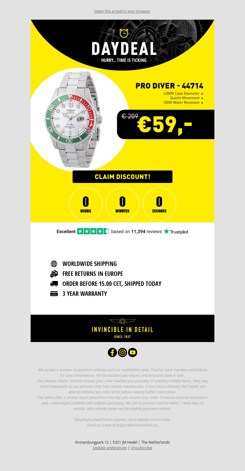 Today's Day Deal: Invicta Pro Diver For Only € 59!