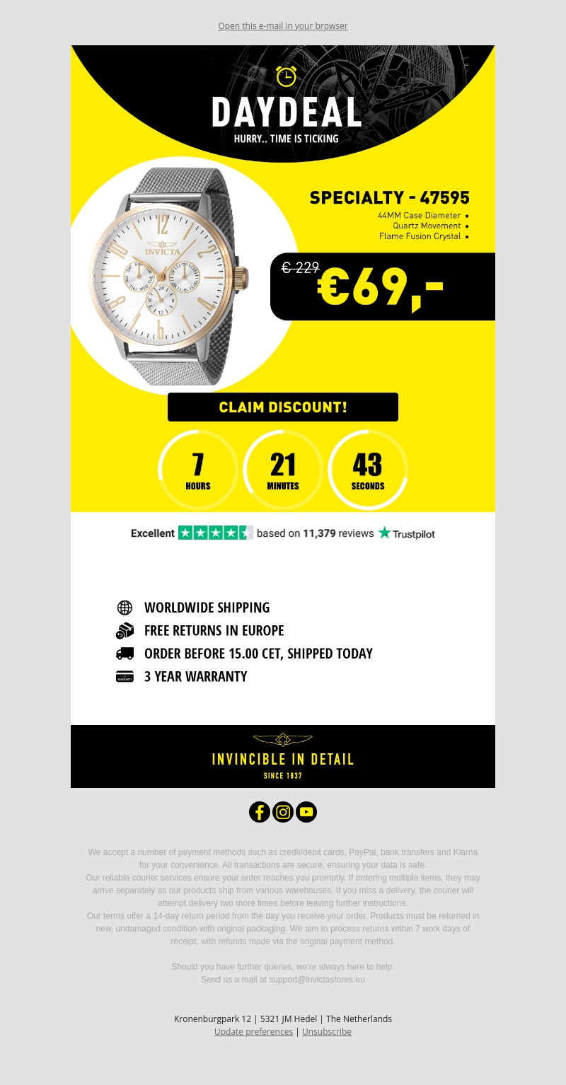 Ontdek de exclusieve dagdeal op het Invicta Specialty horloge, nu voor slechts €69 in plaats van €229. Met een 44MM kastdiameter en quartz uurwerk, biedt dit horloge stijl en precisie. Profiteer van gratis verzending en 3 jaar garantie. Klanten zijn lovend met uitstekende beoordelingen. Wees er snel bij, de aanbieding is slechts tijdelijk geldig.