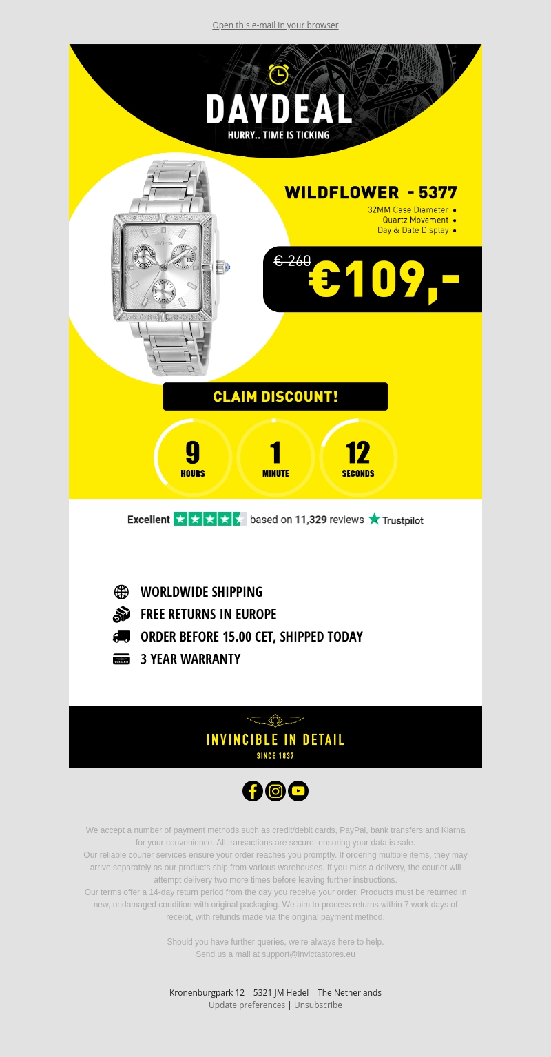 Mis deze kans niet om de stijlvolle Invicta Wildflower dames horloge te bemachtigen voor slechts €109, in plaats van €260. De horloge beschikt over een 32mm kastdiameter, een kwartsuurwerk en een dag- en datumaanduiding. Profiteer van wereldwijde verzending, gratis retourneren in Europa, en een garantie van 3 jaar. Bestel voor 15.00 uur CET en je bestelling wordt vandaag nog verzonden. Beoordeling Trustpilot: Excellent.