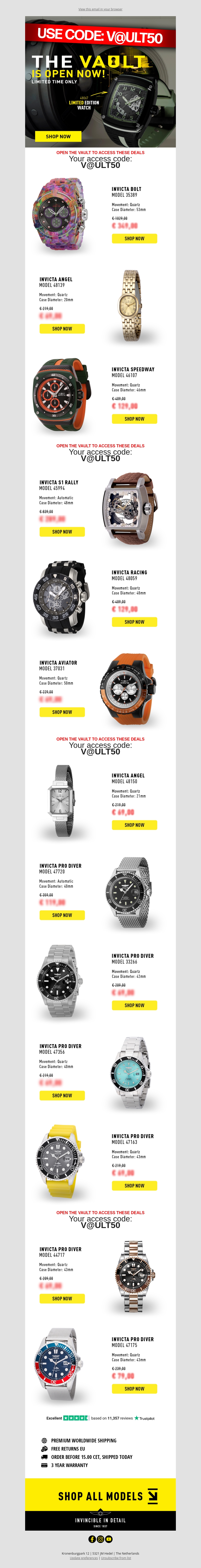 Beleef de ultieme winkelervaring met ongekende kortingen op luxe horloges. Onze Vault Sale biedt u exclusieve deals die u niet wilt missen. Gebruik de speciale code om voordelige prijzen te ontgrendelen en uw favoriet te scoren. Mis deze kans niet om stijlvolle en kwaliteitsvolle horloges te kopen. Deze aanbiedingen zijn slechts tijdelijk, dus handel snel. Pak vandaag nog uw favorieten en bespaar groot!