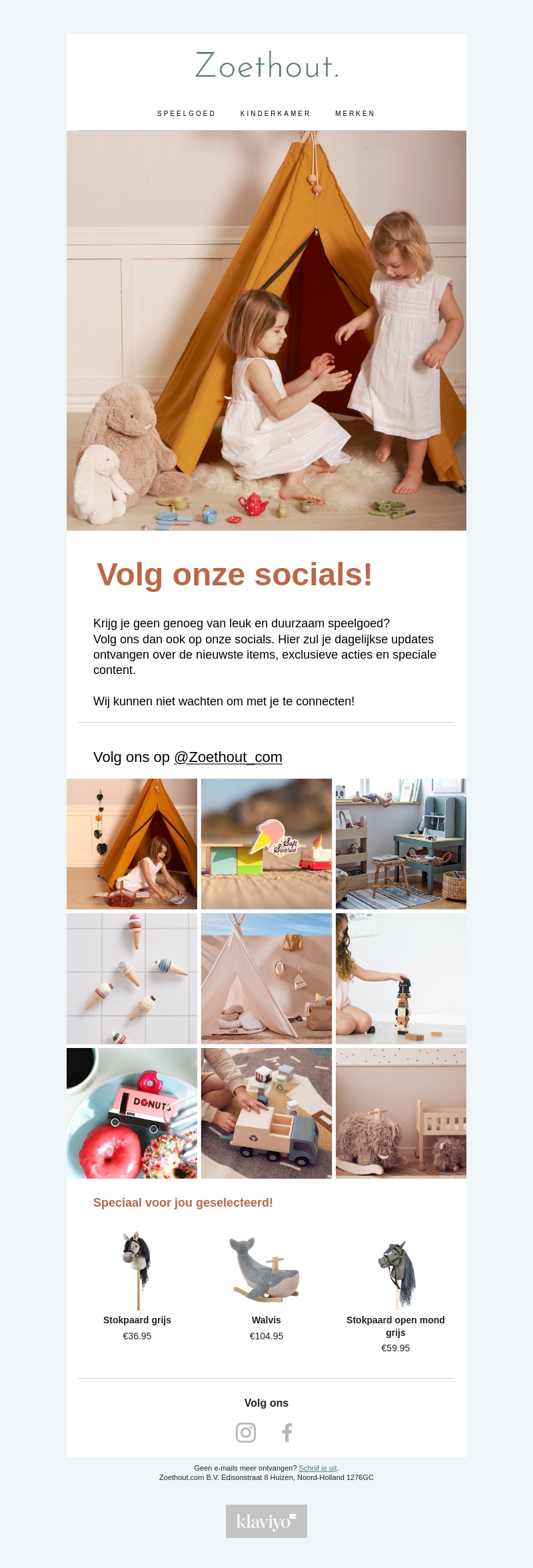 Krijg je geen genoeg van ons leuke en duurzame speelgoed? Volg ons dan op onze social media kanalen. Blijf op de hoogte van de nieuwste items en exclusieve acties. We kunnen niet wachten om met je te connecten!