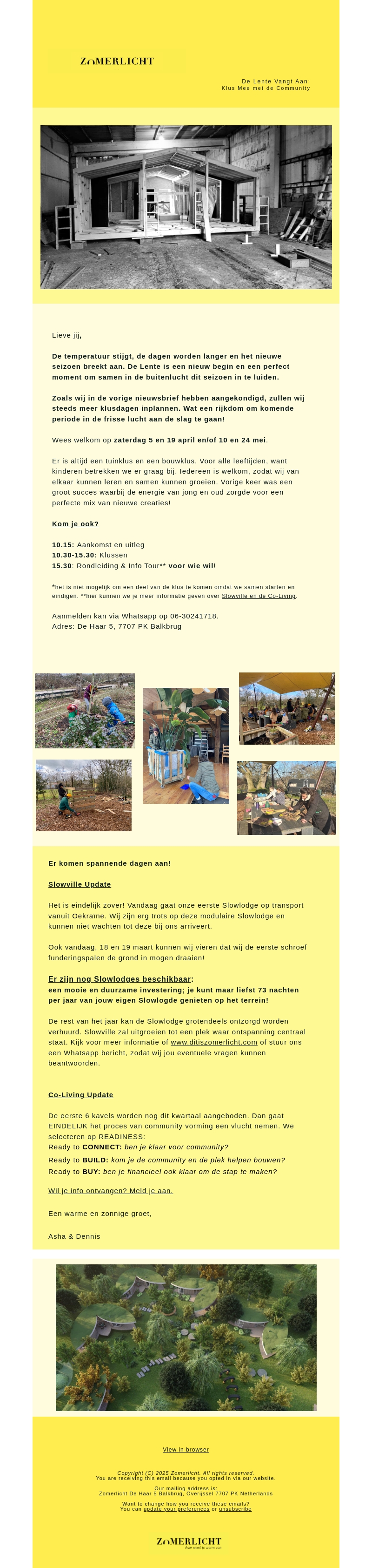 De lente is begonnen, en wat is een betere manier om te starten dan met onze gezamenlijke klusdagen? Doe mee op 5, 19, of 24 april voor leuke activiteiten in de buitenlucht. Of blijf op de hoogte van onze Slowlodge en Co-Living updates. Samen bouwen we aan iets moois!