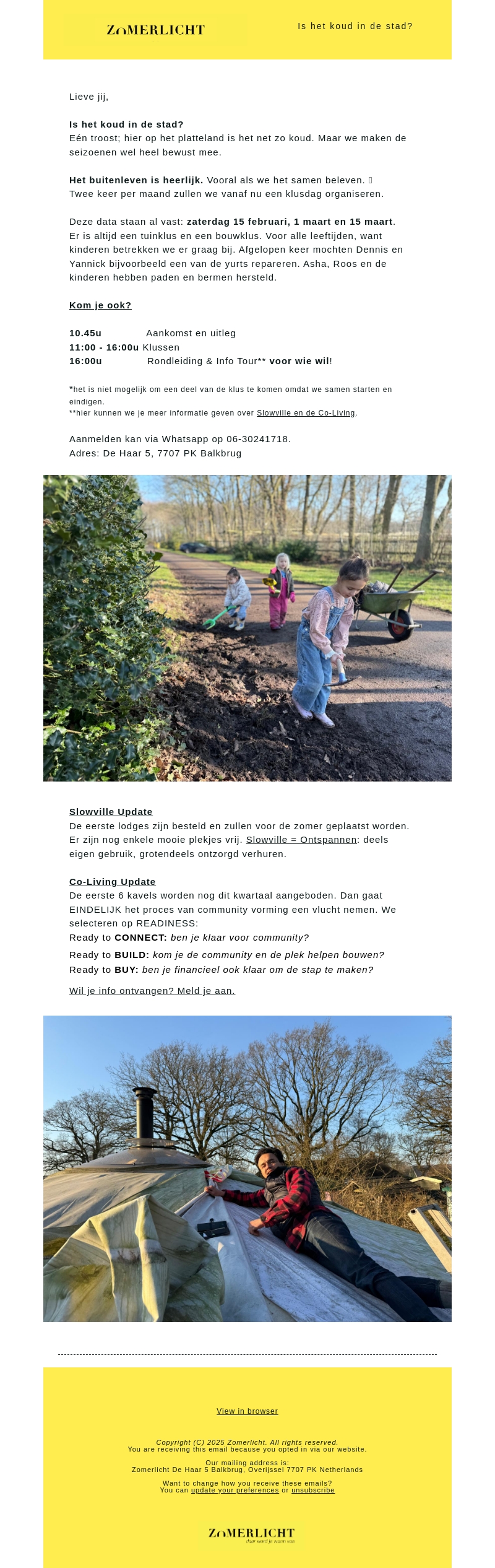 Kom en neem deel aan de Zomerlicht klusdagen met activiteiten voor het hele gezin. Twee keer per maand organiseren we tuinklussen en bouwklussen op ons terrein. Geniet van de natuur en werk samen aan het herstel van ons prachtige landschap. Meld je snel aan via WhatsApp en ervaar de gezelligheid van Slowville en Co-Living.