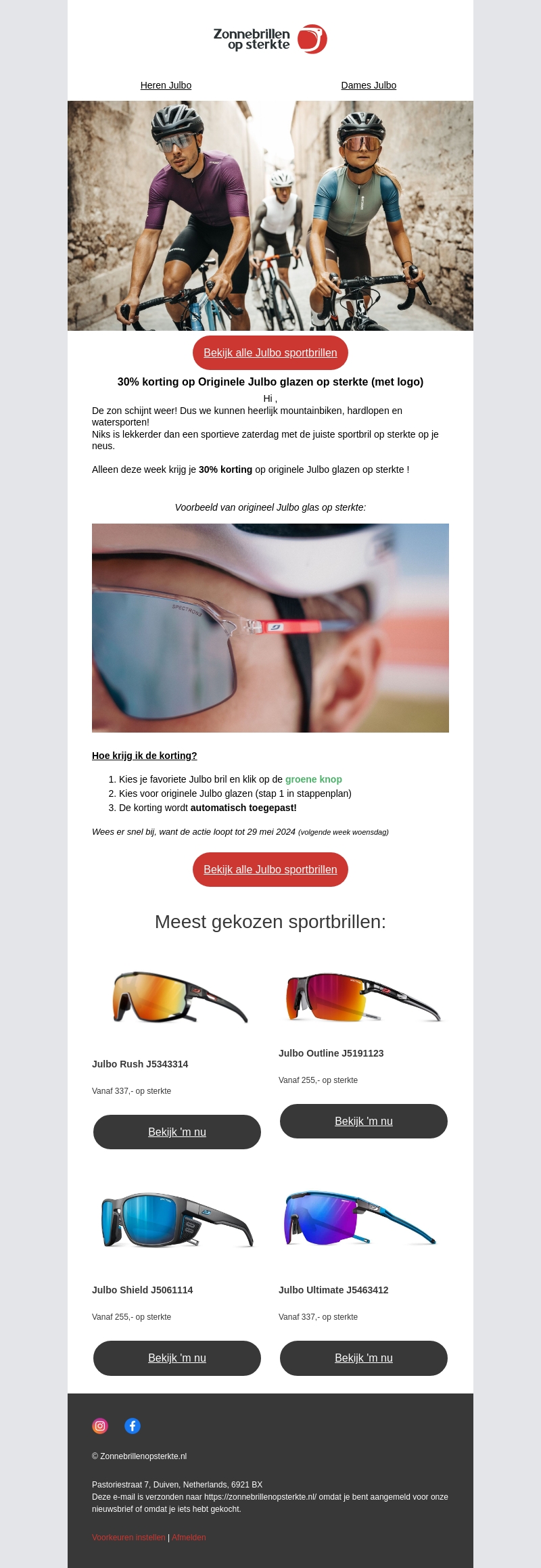 De zon schijnt weer! Dit is het moment om te genieten van mountainbiken, hardlopen en watersporten met de juiste sportbril op sterkte. Ontvang deze week 30% korting op originele Julbo glazen op sterkte. Wees er snel bij, want de actie loopt tot 29 mei 2024.