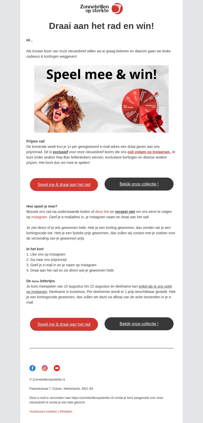 Als trouwe lezer van onze nieuwsbrief willen we je graag belonen. Draai aan het rad en maak kans op fantastische prijzen zoals Ray-Ban brillenkokers en exclusieve kortingen. Deze actie is exclusief voor nieuwsbrieflezers die ons ook volgen op Instagram.