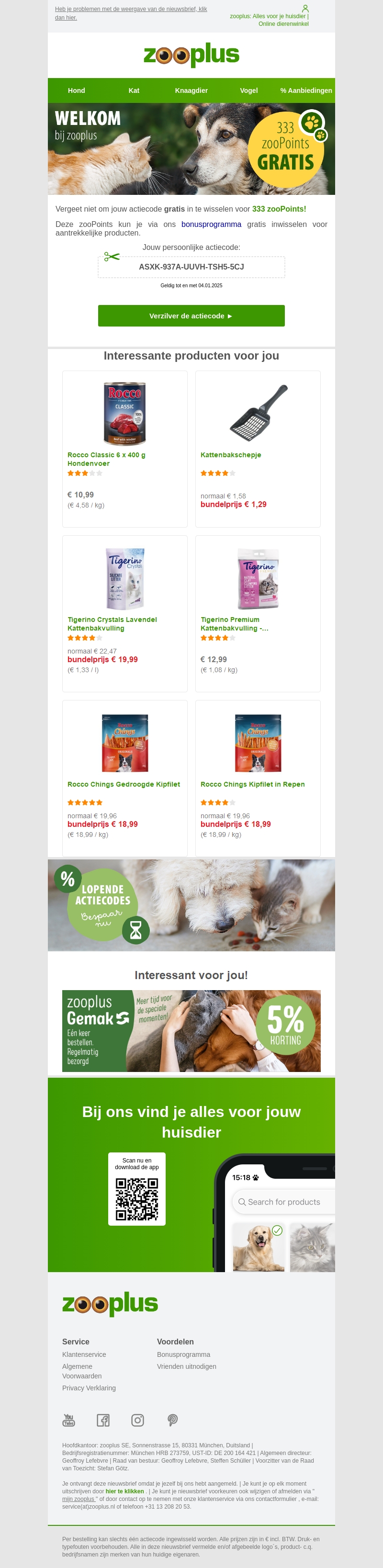 Profiteer nu van 333 gratis zooPoints bij zooplus! Wissel jouw actiecoupon code in en geniet van onze exclusieve aanbiedingen. Bekijk onze selectie van interessante producten voor jouw huisdier en ontdek meer lopende kortingsacties. Blijf op de hoogte van de laatste aanbiedingen en bespaar op jouw aankopen.