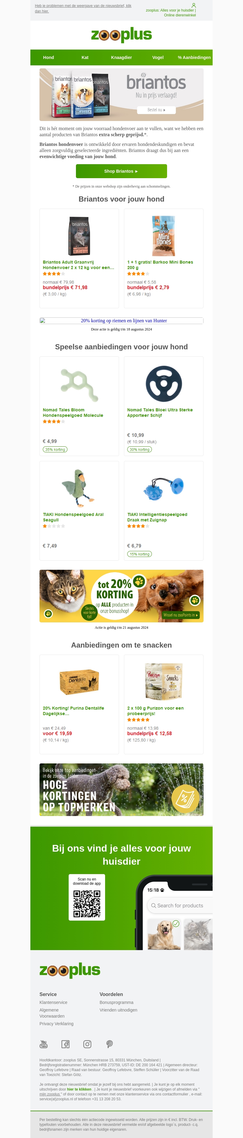 Is jouw hondenvoer bijna op? Profiteer nu van de scherpe prijzen op Briantos hondenvoer bij Zooplus. Daarnaast bieden wij ook speel- en snackaanbiedingen voor jouw hond. Sla nu je voorraad in en bekijk onze nieuwste deals!