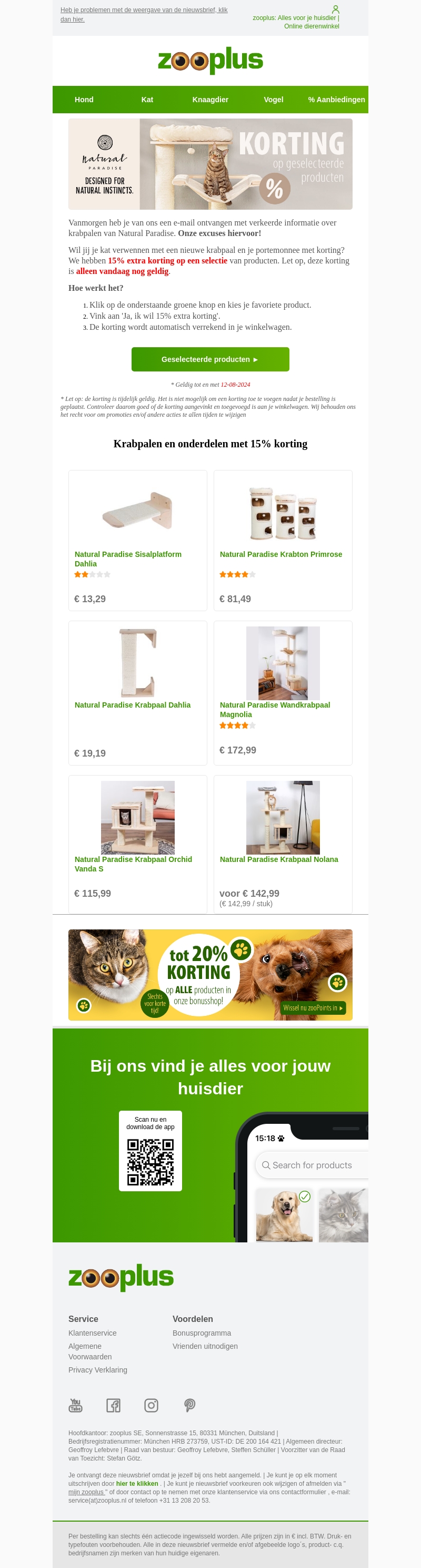 We hebben eerder verkeerde informatie gedeeld over de krabpalen van Natural Paradise. Onze excuses hiervoor! Ter compensatie bieden we nu 15% extra korting op geselecteerde producten. Let op, deze korting is alleen vandaag geldig. Bekijk nu onze selectie van krabpalen en geniet van de korting!