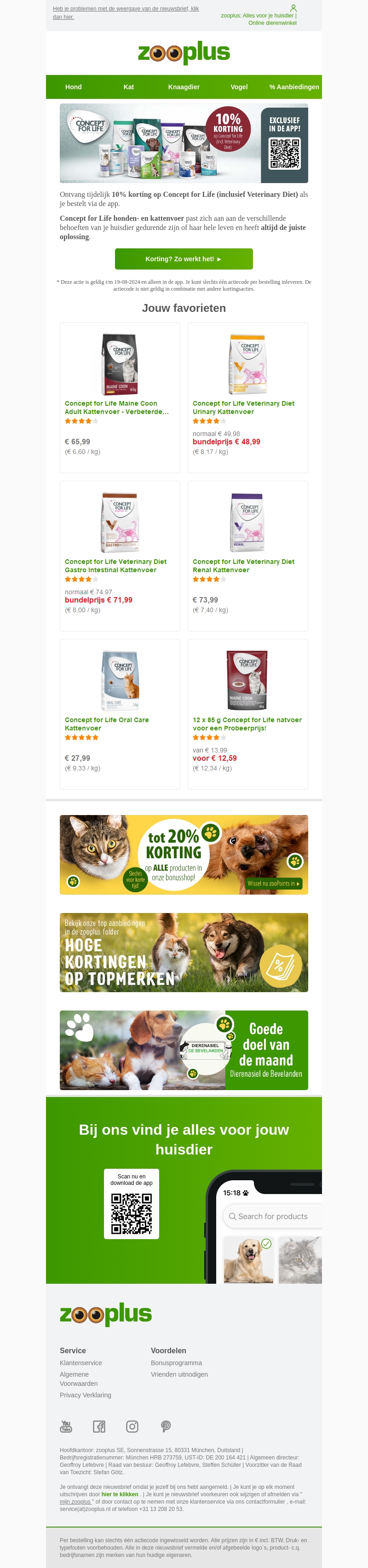 Verdien tijdelijk 10% korting op honden- en kattenvoer van Concept for Life, inclusief Veterinary Diets, bij Zooplus. Deze aanbieding is exclusief beschikbaar in de app en is geldig tot 19-08-2024. Mis deze kans niet om je huisdier te verwennen met hoogwaardige voeding.
