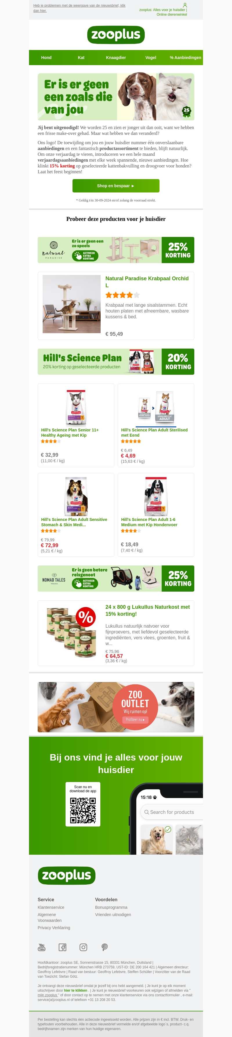 Zooplus viert zijn 25ste verjaardag met spectaculaire aanbiedingen en onvergetelijke kortingen. Ontvang een gratis verjaardagsaanbieding en geniet van kortingen tot 15% op geselecteerde producten. Bekijk het uitgebreide assortiment van producten voor je huisdier en bespaar vandaag nog!