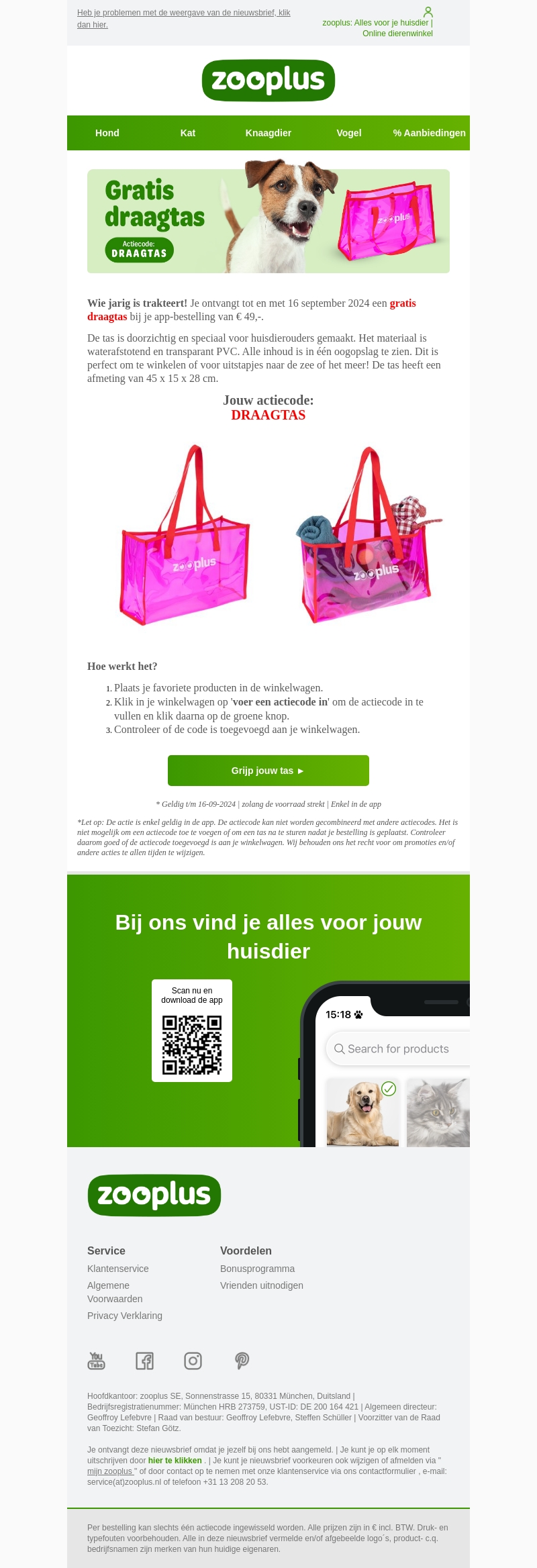 Zooplus trakteert! Ontvang tot en met 16 september 2024 een gratis draagtas bij je app-bestelling vanaf € 49,-. Deze transparante tas is perfect voor huisdieruitjes en boodschappensessies. Gebruik de code DRAAGTAS in je winkelwagen om de tas te claimen.