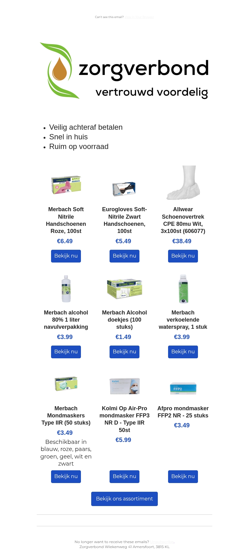 Ontdek een ruime selectie producten voor veilig en hygiënisch werken in Nederland en België. Zorgverbond biedt hoogwaardige handschoenen, mondmaskers en meer, allemaal snel leverbaar. Profiteer van veilige achterafbetalingen en ruime voorraden voor al uw behoeften.
