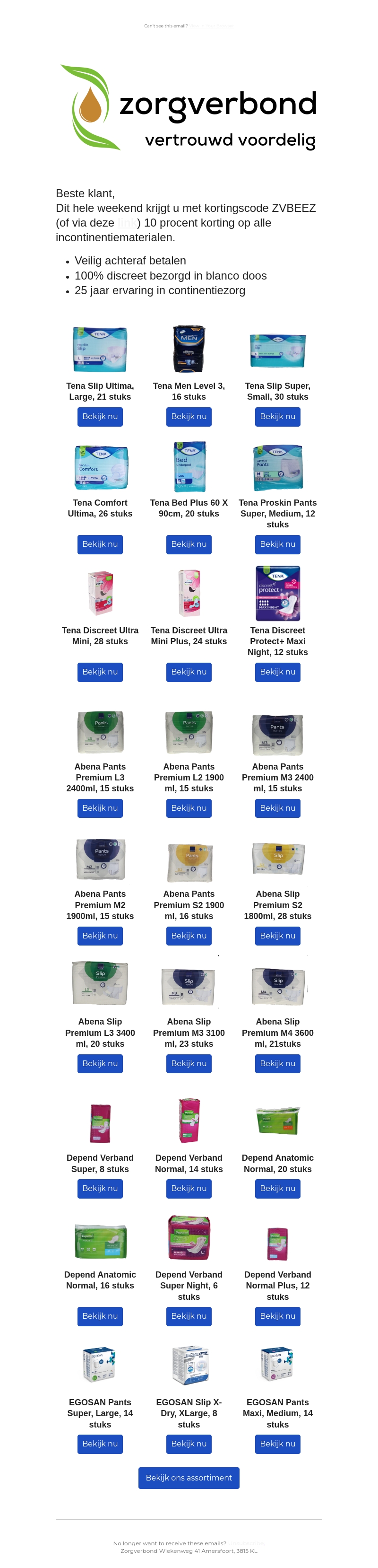 Beste klant, dit weekend biedt Zorgverbond u 10% korting op alle incontinentiematerialen met de kortingscode ZVBEEZ. Geniet van veilig betalen, discrete levering en 25 jaar ervaring in continentiezorg. Mis deze kans niet om uw favoriete producten voordelig aan te schaffen.