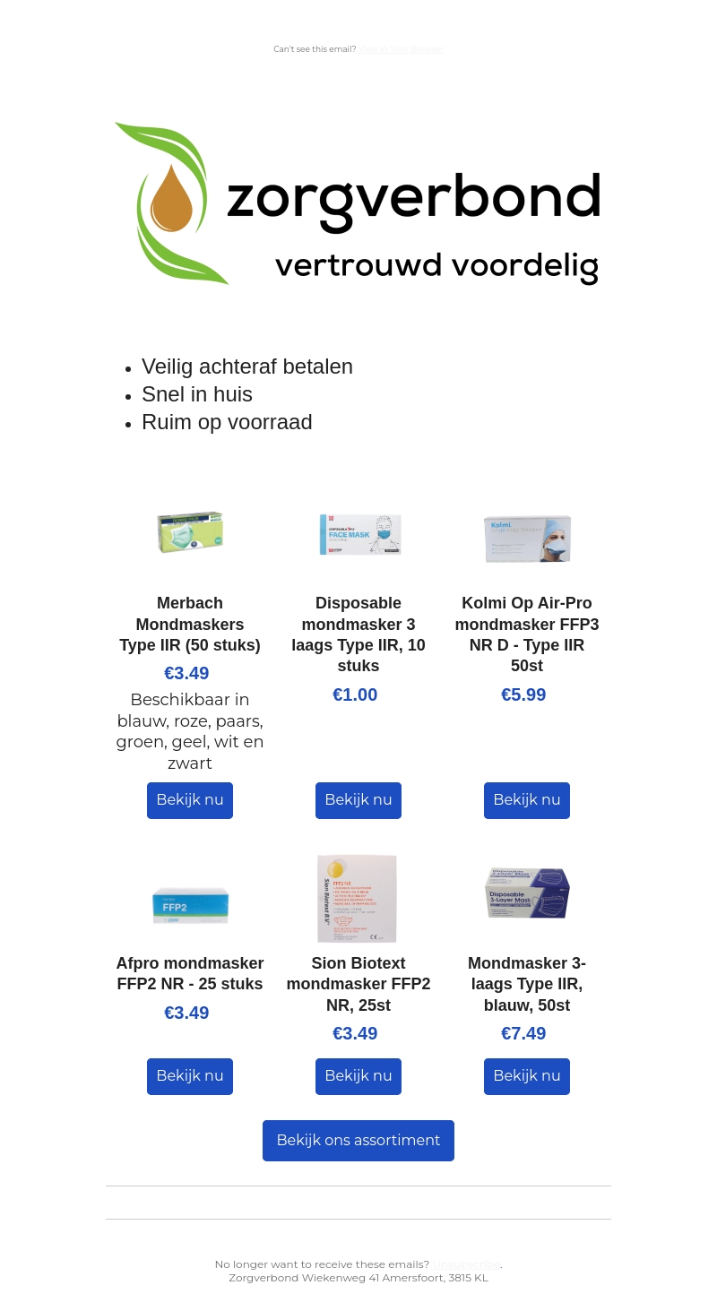 Zorgverblijf biedt een breed scala aan mondmaskers die beschikbaar zijn in meerdere kleuren en typen. Bestel nu Merbach, Disposable en Kolmi Op Air-Pro maskers voor de beste prijs. Alle maskers zijn ruim op voorraad en worden snel geleverd in Nederland en België. Vergeet niet veilig achteraf te betalen en profiteer van ons ruime aanbod!