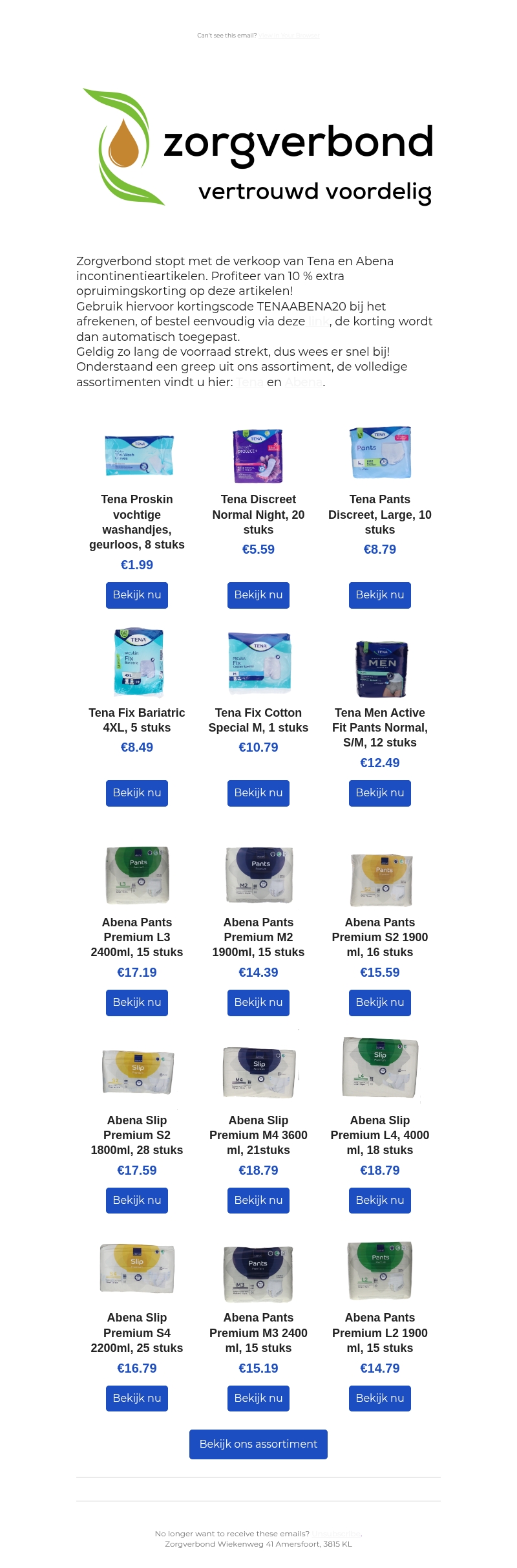 Opruimingsuitverkoop Tena en Abena bij Zorgverbond. Nu 20 procent extra korting!
