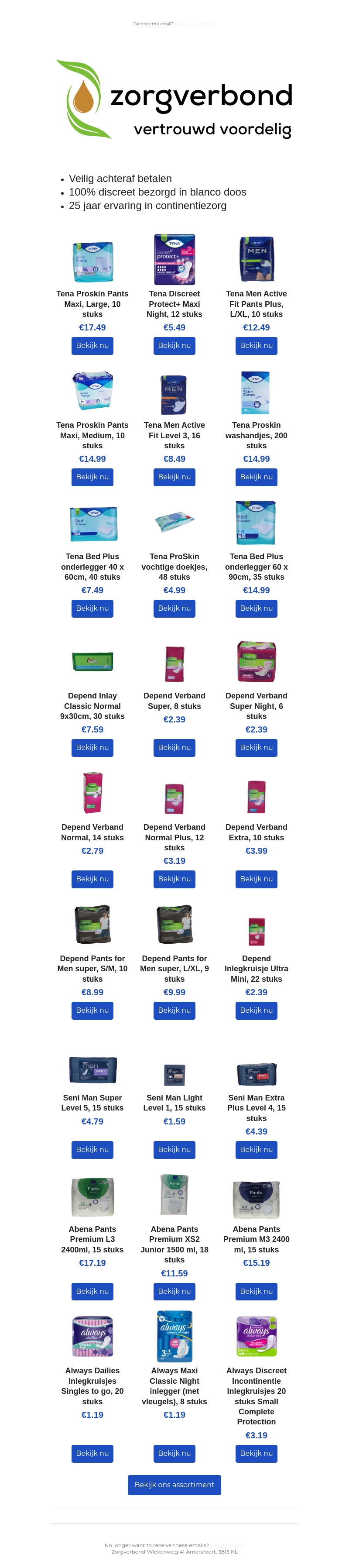 Bij Zorgverbond vind je een uitgebreid assortiment aan incontinentieproducten van bekende merken zoals Tena, Depend en Abena. Profiteer van scherpe prijzen en een betrouwbare service. Producten worden discreet en snel bij je thuisbezorgd. Vertrouw op meer dan 25 jaar ervaring in continentiezorg. Bezoek onze website en bestel gemakkelijk jouw producten online.