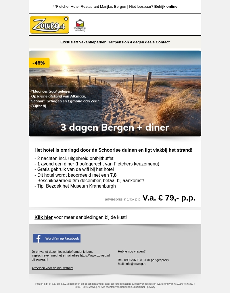 Beleef een heerlijke 3-daagse vakantie in Bergen inclusief diner vanaf €79,- per persoon. Het hotel ligt vlakbij het strand en de Schoorlse duinen. Profiteer van een uitgebreid ontbijtbuffet, gratis wifi, en aantrekkelijke prijzen tot december. Bezoek lokale attracties zoals Museum Kranenburgh.