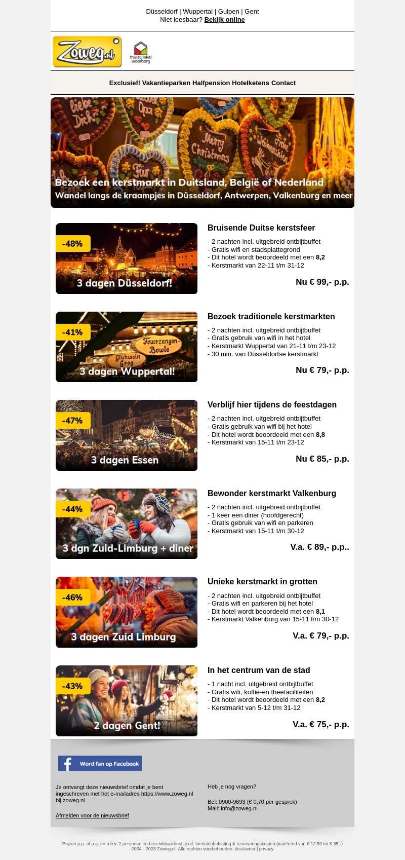 Kom in de kerststemming met een bezoek aan een kerstmarkt in Duitsland, België of Nederland. Geniet van kortingen tot wel 48% op accommodaties met ontbijt en gratis wifi. Ontdek markten in Düsseldorf, Wuppertal, Essen, Zuid-Limburg en Gent. Inclusief exclusieve deals vanaf slechts €75,- per persoon.
