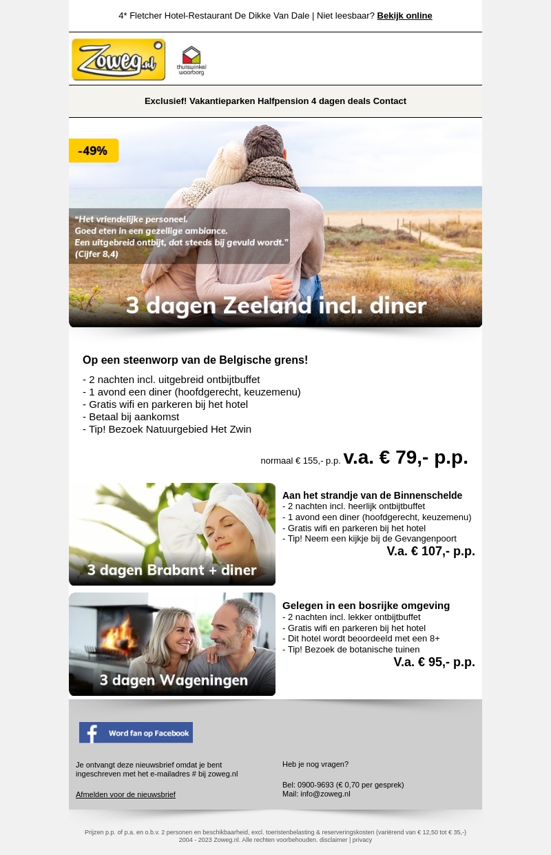 Geniet van een heerlijke 3-daagse vakantie in Zeeland inclusief diner vanaf slechts €79 per persoon. Verblijf in een gezellige omgeving met uitstekende service en een uitgebreid ontbijtbuffet. Ervaar een comfortabele overnachting dicht bij de Belgische grens en maak gebruik van gratis wifi en parkeren. Bezoek het prachtige natuurgebied Het Zwin en geniet van een zorgeloos verblijf.